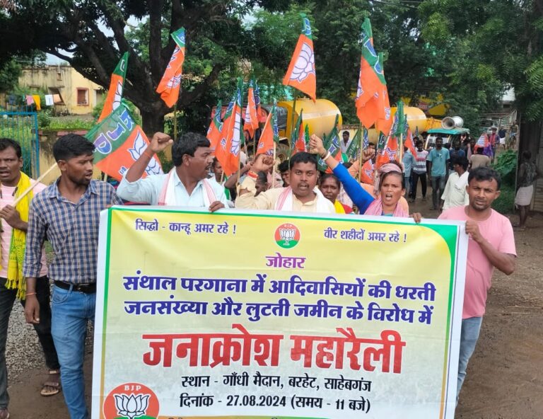 बरहेट/साहिबगंज(उजाला)।भाजपा अनुसूचित जनजाति मोर्चा के जिला अध्यक्ष चौकीदार हादसा के नेतृत्व में मंगलवार को एसटी मोर्चा के बैनर तले जनाक्रोश महा रैली निकाला गया।जनाक्रोश महारैली में अनुसूचित जनजाति के प्रदेश मंत्री रविंद्र टुडू, जिला मंत्री रानी हासदा सामिल हुए।इस दौरान रैली गांधी मैदान से निकलकर प्रखंड मुख्यालय पहुंचा, तत्पश्चात राजपाल के नाम से प्रखंड के आंचल नाजीर अशोक महतो को ज्ञापन सोपा।इस दौरान प्रदेश मंत्री रविंद्र टुडू ने कहा कि संथाल परगना सहित पूरे झारखंड प्रदेश में आदिवासियों की जनसंख्या घटना एवं आदिवासी की जमीन लुप्त होना इसका मुख्य जिम्मेदार हेमंत सरकार है।क्योंकि हेमंत सरकार बांग्लादेशी घुसपैठियों को संरक्षण मिल रहा है।महारैली के दौरान पाकुड़ में आदिवासी के साथ हिंसा हुई घटना को जिक्र किया।राज्य सरकार आदिवासियों को तरह-तरह के वादे कर वोट बैंक का इस्तेमाल किया।यहां तक की आदिवासियों की जनसंख्या दिन प्रतिदिन घटती जा रही है।इस पर राज्य सरकार की कोई चिंता नहीं है,और नाही इस बिंदु पर कोई कदम उठाए हैं।इस दौरान नरेंद्र मोदी जिंदाबाद, बाबूलाल मरांडी जिंदाबाद के नारे लगाए।मौके पर ज्योतिष हेमराम, जॉन मुर्मू , हनीफ, दुलाल,जोसेफ,लाल , के अलावा अन्य कार्यकर्ता मौजूद थे
