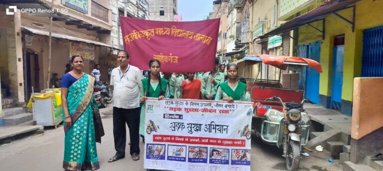 साहिबगंज(उजाला)।जिला परिवहन पदाधिकारी श्री विष्णु देव कच्छप के नेतृत्व में राजकीय मध्य विद्यालय तालाब साहेबगंज के द्वारा सड़क सुरक्षा पर जागरूकता रैली निकाली गई। जिला परिवहन पदाधिकारी एवं प्रभारी प्रधानाध्यापक के द्वारा सड़क सुरक्षा मानव जीवन के लिए अत्यंत महत्वपूर्ण जानकारी दी है। हमारे समाज में हर रोज हजारों लोग यातायात दुर्घटनाग्रस्त के शिकार होते है।जिनसे कई लोगों की जान चली जाती है, सङक सुरक्षा के लिए नियमित नियम बनाए गए है। जिनका पालन करके सड़कों पर होने वाली दुर्घटना को रोका या कम किया जा सकता है।मौके पर जिला सड़क सुरक्षा प्रबंधक नीरज कुमार साह, प्रधानाध्यापक मनोज कुमार, रोड इंजिनर एनालिस्ट अनुज प्राशर, आईटी सहायक राजहंस एवं अन्य अध्यापक/अध्यापिका गण एवं छात्र छात्राओं मोजूद रहे।