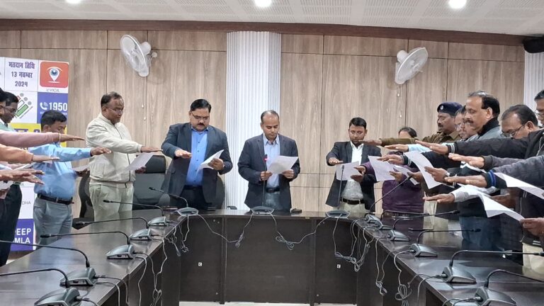 गुमला: आज संविधान दिवस के अवसर पर उपायुक्त श्री कर्ण सत्यार्थी की अध्यक्षता में समाहरणालय स्थित सभागार में शपथ ग्रहण समारोह का आयोजन किया गया। इस समारोह में सभी पदाधिकारियों एवं कर्मियों ने संविधान की उद्देशिका के प्रति अपनी निष्ठा और समर्पण की शपथ ली।उपायुक्त ने अपने संबोधन में भारतीय संविधान की महत्ता पर प्रकाश डालते हुए इसे देश की लोकतांत्रिक व्यवस्था और नागरिक अधिकारों का आधार स्तंभ बताया। उन्होंने कहा कि संविधान हमें न केवल अधिकार देता है, बल्कि हमारे कर्तव्यों का भी स्मरण कराता है। उन्होंने सभी से अपील की कि वे संविधान में निहित मूल्यों – स्वतंत्रता, समानता, और न्याय – को अपने कार्यों और आचरण में आत्मसात करें।इस अवसर पर उपस्थित अधिकारियों और कर्मियों ने संविधान के प्रति अपनी प्रतिबद्धता दोहराई और देश की एकता, अखंडता, एवं समृद्धि के लिए समर्पित होकर कार्य करने का संकल्प लिया।आज के कार्यक्रम में मुख्य रूप से उप विकास आयुक्त गुमला, अपर समाहर्ता गुमला, जिला नजारत उप समाहर्ता गुमला, जिला योजना पदाधिकारी गुमला सहित विभिन्न विभागों के पदाधिकारी एवं कर्मी उपस्थित रहें