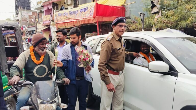 कुडू : जिले के विभिन्न प्रखंड क्षेत्र के चौक चौराहे में मंगलवार क़ो आमजन को यातायात नियमों के प्रति जागरूक करने के लिए चलाए जा रहे 40 वें सड़क सुरक्षा सप्ताह के तहत यातायात पुलिस और परिवहन विभाग के संयुक्त तत्वावधान में वाहन चालकों को फूल देकर यातायात नियमों का पालन न करने की अपील की गई है। मोटरयान निरीक्षक गौतम गौरव ने बताया कि सड़क सुरक्षा सप्ताह के शुरूआत में सभी वाहन चालकों को हेलमेट और सीट बेल्ट लगाने के साथ ही यातायात नियमों का पालन करने की अपील की जा रही है। इसके बाद भी यदि कोई यातायात नियमों की पालना नहीं करता है, तो चालान बनाकर जुर्माना वसूल करने की कार्रवाई की जाएगी। उन्होंने कहा कि लोग सड़क सुरक्षा के नियमों का अनुपालन नही कर खुद की व अपने परिवार के जीवन को खतरे में डाल रहे है। कहा कि हर साल लाखों लोग सड़क हादसा का शिकार हो जाते हैं। कारण सिर्फ एक ही है लोग सड़क सुरक्षा के प्रति जागरूक नही है। अगर लोग सड़क सुरक्षा के प्रति जागरूक हो जाएंगे और सुरक्षा के बताए नियमों के अनुसार वाहन चलाएंगे तो हादसों में कमी आएगी। पुलिसकर्मियों और परिवहन विभाग के अधिकारियों द्वारा यातायात नियमों की अवहेलना करने वाले वाहन चालकों को फूल देकर नियमों का पालन करने की अपील की है। इस दौरान यातायात नियमों का पालन करने वाले वाहन चालकों का माला पहना कर स्वागत किया गया। मौके पर ट्रैफिक इंचार्ज शिवशंकर मार्डी, डीआरएसएम अमृतेश्वर गिरी, मोटर व्हीकल इंस्पेक्टर गौतम गौरव, रोड सेफ्टी इंजीनियर कृष्णा कुमार, सब इंस्पेक्टर सुशील कुमार, सहायक पुलिस समेत अन्य मौजूद थे